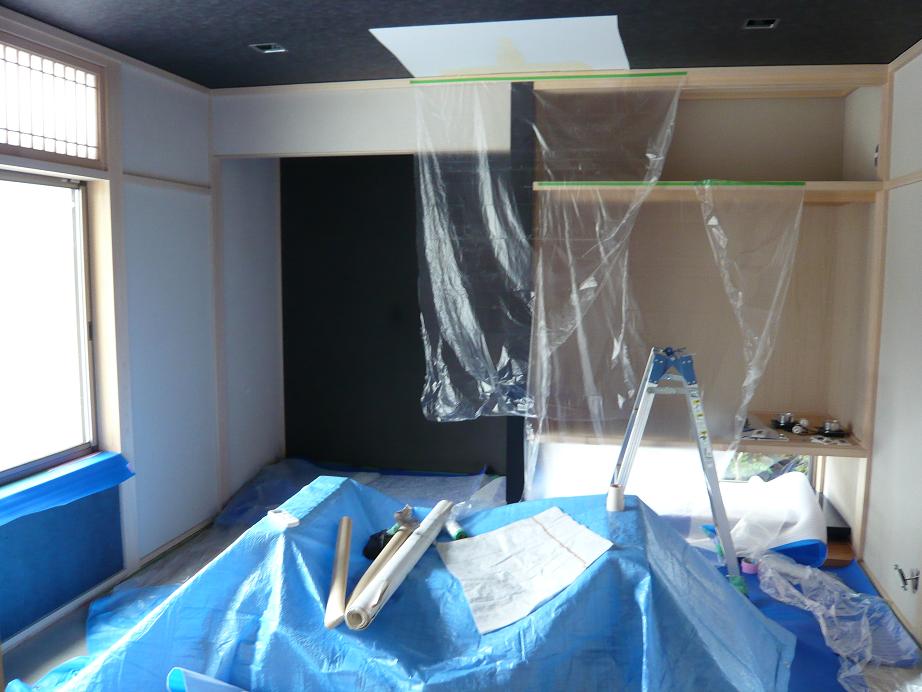 神棚の中を塗り塗りです~本来なら、クロス仕上げなのに。。。左官屋さんのミスで土壁になってしまった所なんですょ