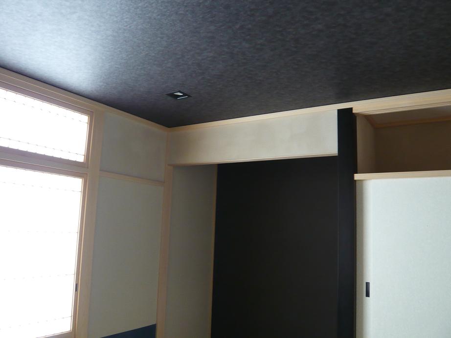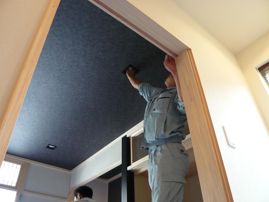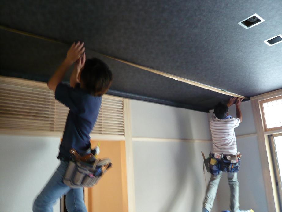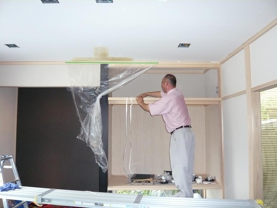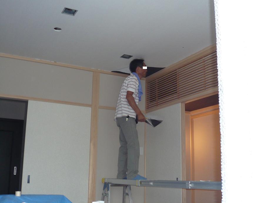 天井クロスが完成したので、電気屋の兄ちゃんがダウンを装着中でした