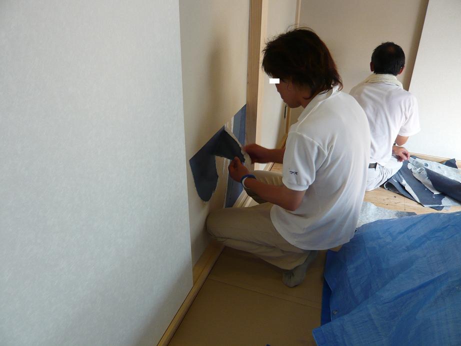 お家の中では和室で、この間変更になった和紙が貼られてる所です~ 薄い色のブルーから濃い色になってしまったんですが、これは床板の色に合っててイイ感じです~ クロス屋さんありがとうございます