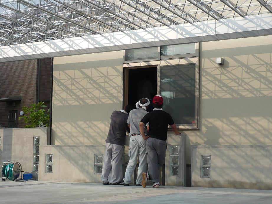 この日から以前、UPした玄関天井&床板修正に入ります。 今回は、今貼ってあるクロスを剥がさずに。。。その上から『コアシート』を貼って養生 ![]() そして、その上から通常のクロスを貼っていくそぉです~ その前に、玄関から廊下(坪庭FIX)にかけてビッチリ養生です~ 密かに、黒ヘルの親ビンが来る てって勝手に思ってたのに、来ませんでしたね~親ビン、うまく出来上がらなかったからショック死したかなー ![]() ノンキにボケーーって見てる間に取り外し完了です。 これが、終わったら電気屋さんは他の現場があるからーって帰っていきました ![]() ![]() の、前に少し世間話をしてたんです~ 密かに、プチ見学会もしたなー 兄ちゃんは、リビングのアクリルパネルが気になる存在なんだそぉですよ~ 生産Oさんも、来てくれました~ 向こうがOさん 手前が新人君です。この時に知ったんですけどね。。。 この間、リビングテーブルを見に展示場に行った時。。。お嬢の相手をしてくれた兄ちゃんが、この新人君だったそぉです。 あの時はありがとね~ 10月まで、新人研修なんですって ![]() 色んな現場に一緒に行って色々見て聞いてするみたいです~ 頑張れ 新人君~そして、Nさんバリな営業さんになって下さいね~リビングに広げられている白いクロスみたいなのが『コアシート』(←クリックプリーズ)です。要するに、下地材なんです ![]() コアシートは、乾くのに普通のクロスに比べて時間がかかるそぉです。 この日、貼って明日1日養生期間を取るそぉです。 今度こそ うまくいくのを願うだけです。頼むぜ コアシートちゃぁん~ナゼゆえに、匍匐前進 ![]() って、思うでしょ~この間、リビングに居た時に修正忘れを見つけてたんですね~この日、修正屋さんが入るので一緒に直してもらう事になってたんですが。。。 先ほどの、コアシートを広げてた為に傷が行方不明になってしまったんです ![]() ってな、訳でOさんが匍匐前進スタイルで頑張って探してくれてたんです~ Oさん今回も、ネタ提供ありがとうございます~ 和室の中が、どんな事になってるのか 気になる所なんですがね。。。終了まで、立ち入り禁止区域に指定されたんです ![]() ![]() うぅぅ ![]() 気になるぜー いつもの、私ならコッソリ覗きに入るんですが。。。埃などが入って失敗したら私の責任になるので、今回バッカリは我慢我慢 です。我慢してるので、今度こそ成功させて下さいね~頼んだぜ ![]() 夕方ですが、注文しておいた時計が届いた っていうので高松まで急いで行ってきました~そんな時、電気屋の兄ちゃんの車とすれ違いました 兄ちゃん達も気が付いてたみたぃで、振り返って見てましたね~仕事も、終わって丁度帰ってる所やったんでしょうね~ ォツカレー 戻ってくると。。。 そらそぉですよね。。。7:00ですから と言うてもこの明るさ です。前日の波も、少し進化してました 半分弱といった所でしょうかね![]() 疑問なのは、上のRになった所って、どんな風に作るんだろー って事です。明日にでも、聞いてみます~ 裏から見てみましたょ~ 庵治石のパーテーションも随分上がりました ![]() この後、どんな風になるのかも全然分からないから気になりますね~ そぉそぉ、明日からドイツの方が来てくれるそぉです。 聞く所によると、ドイツってお国は、道路・歩道・玄関などにピンコロを敷いてるそぉです ピンコロを扱わせたらピカイチなんですよ って言うてましたね~どんな方が来てやってくれるのか、スッゴク楽しみです。 明日は、一気に荷物が届きます。 電気製品・家具・ピアノ・・・最終は、住林でお願いしたソファーと座卓です。 朝から、夕方まで大勢の人が出入りするんだろな~ 1番手は10:00です。頑張って行ってきますー |